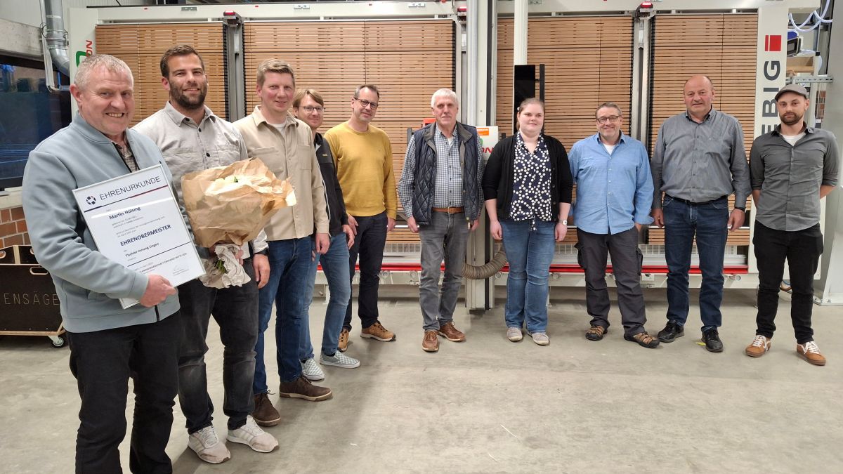Im Rahmen der Wahlen wurde Martin Hülsing auf einstimmigen Beschluss der Versammlung für seine Verdienste zum Ehrenobermeister ernannt. In seiner Laudatio würdigte der neue Obermeister Sebastian Pawelleck Hülsings langjähriges Engagement, seine Fachkompetenz sowie seine Verdienste um die Innung und das regionale Handwerk. „Martin Hülsing hat die Tischler-Innung Lingen nicht nur geleitet, sondern auch geprägt und vorangebracht. Dafür gebührt ihm unser aller Respekt und Dank“, so Pawelleck.