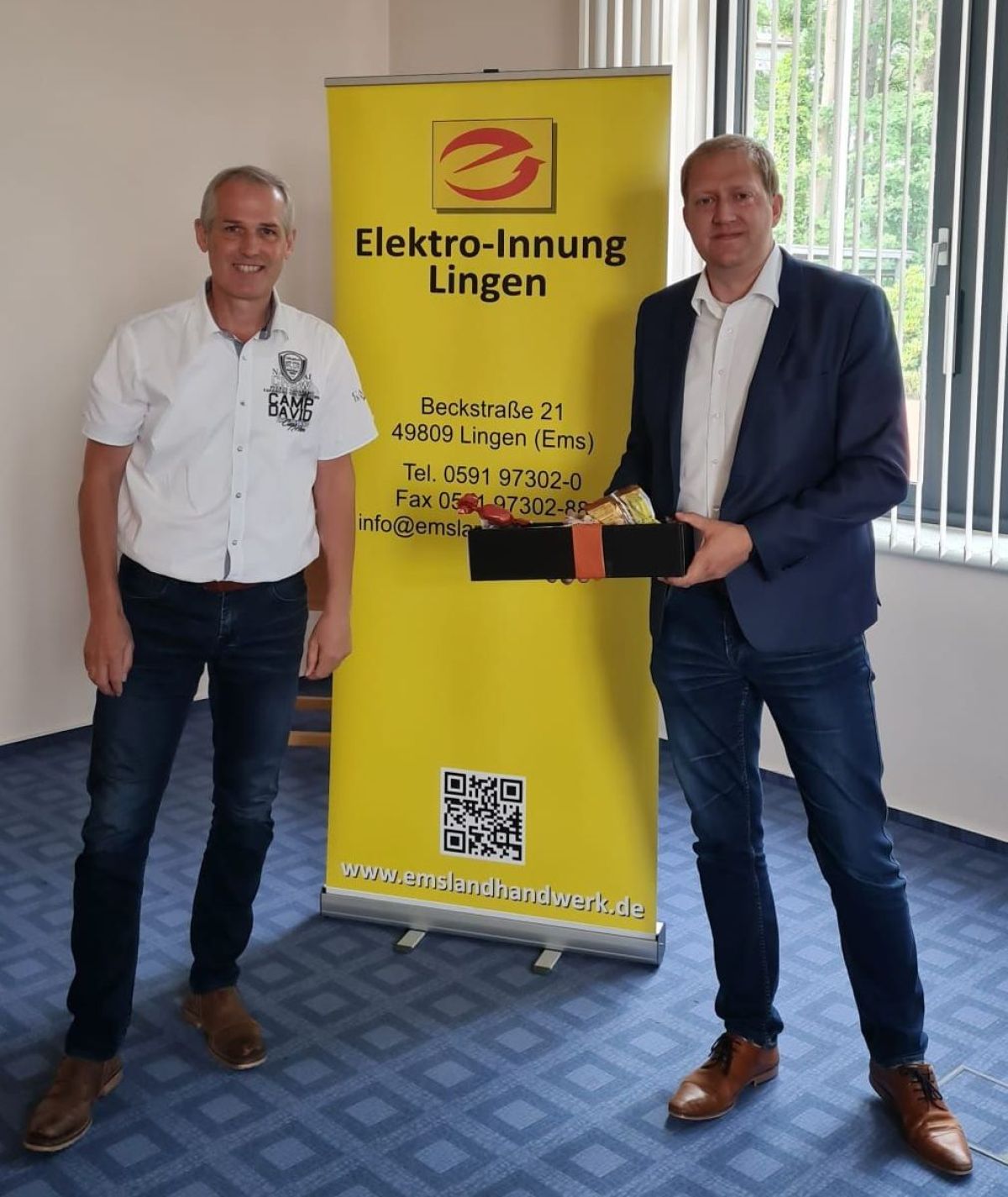 Mit einem Präsent bedankte sich Obermeister Hermann Reekers (links) bei Herrn Hinrichs für einen informativen Vortrag. Hermann Reekers als Obermeister der Innung der Elektro-Handwerke Lingen bestätigt