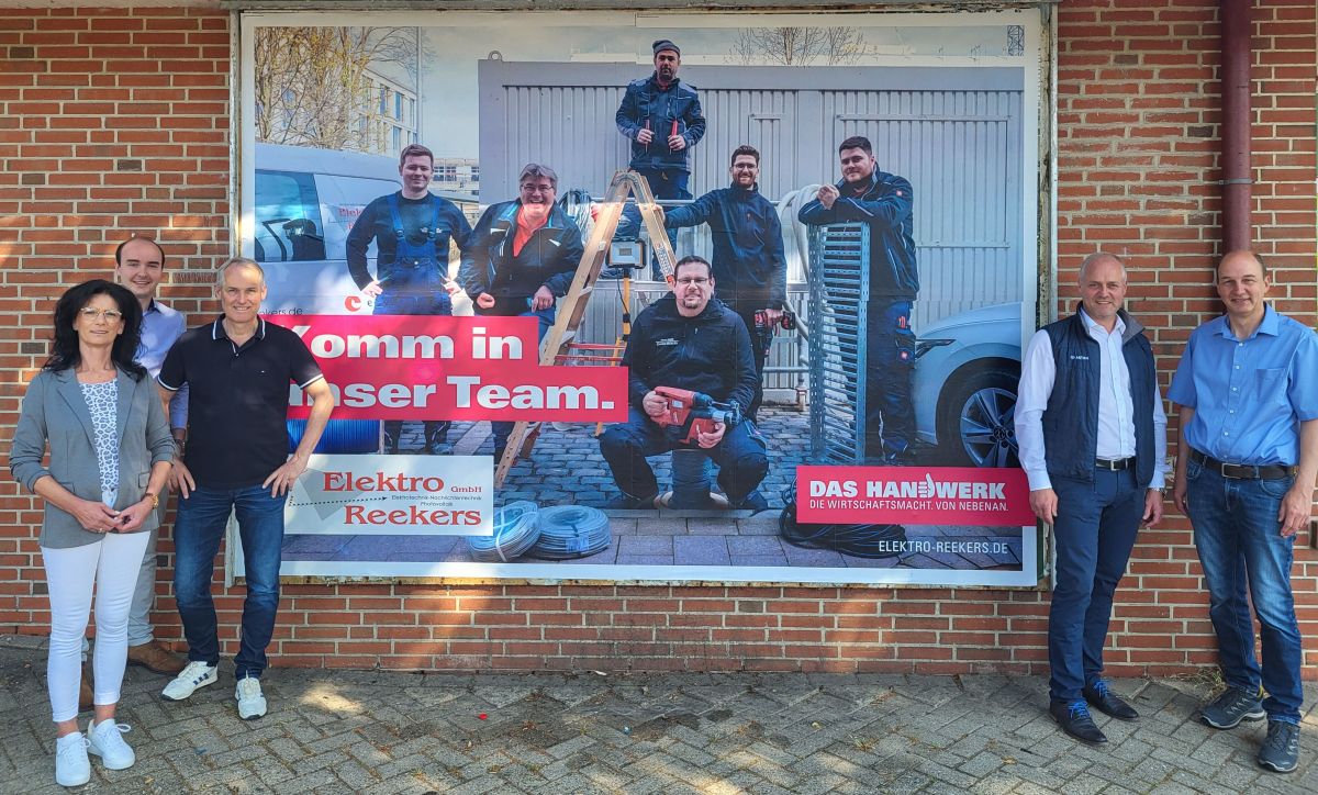 Die Kreishandwerkerschaft Emsland Mitte-Süd freut sich über die erfolgreiche Teilnahme zahlreicher Innungsbetriebe an der Mitmach-Aktion „Nebenan ist hier“ zum Jahresende 2022. Im Rahmen dieser Aktion hatten die Betriebe die Gelegenheit, sich im bekannten Design der bundesweiten Imagekampagne des Handwerks zu präsentieren. Unter dem Motto "Die Wirtschaftsmacht bekommt unser Gesicht." wurde ein kostenfreier Grafikservice angeboten, der individuelle Werbemittel für die tägliche Kundenansprache sowie für ein professionelles Recruiting gestaltete. Ein ganz besonderer Hauptgewinn lockte die Teilnehmer: Das persönliche Motiv auf den Plakatwänden rund um den eigenen Betriebsstandort. Über diese großartige Werbemöglichkeit freut sich nun die Firma „Elektro Reekers GmbH“, ein renommiertes Elektrohandwerksunternehmen aus Lünne, das mit ihrem sympathischen und kreativen Teambild überzeugte.