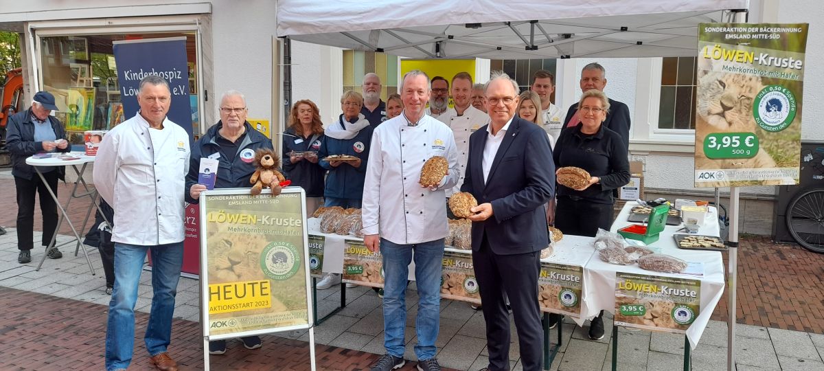 Am heutigen Tag startete die Bäckerinnung Emsland Mitte-Süd die 18. Sonderaktion „Brotverkauf für einen sozialen Zweck“. Auf einem gemeinsamen Verkaufsstand in der Lingener Innenstadt stellten die 12 teilnehmenden Innungsbäcker das diesjährige Aktionsbrot vor. Bei der Löwen-Kruste handelt es sich um ein 500 g schweres Mehrkornbrot mit einer Extraportion Hafer. Das Kinderhospiz Lingen erhält pro verkauftem Brot eine Spende von 0,50 €.